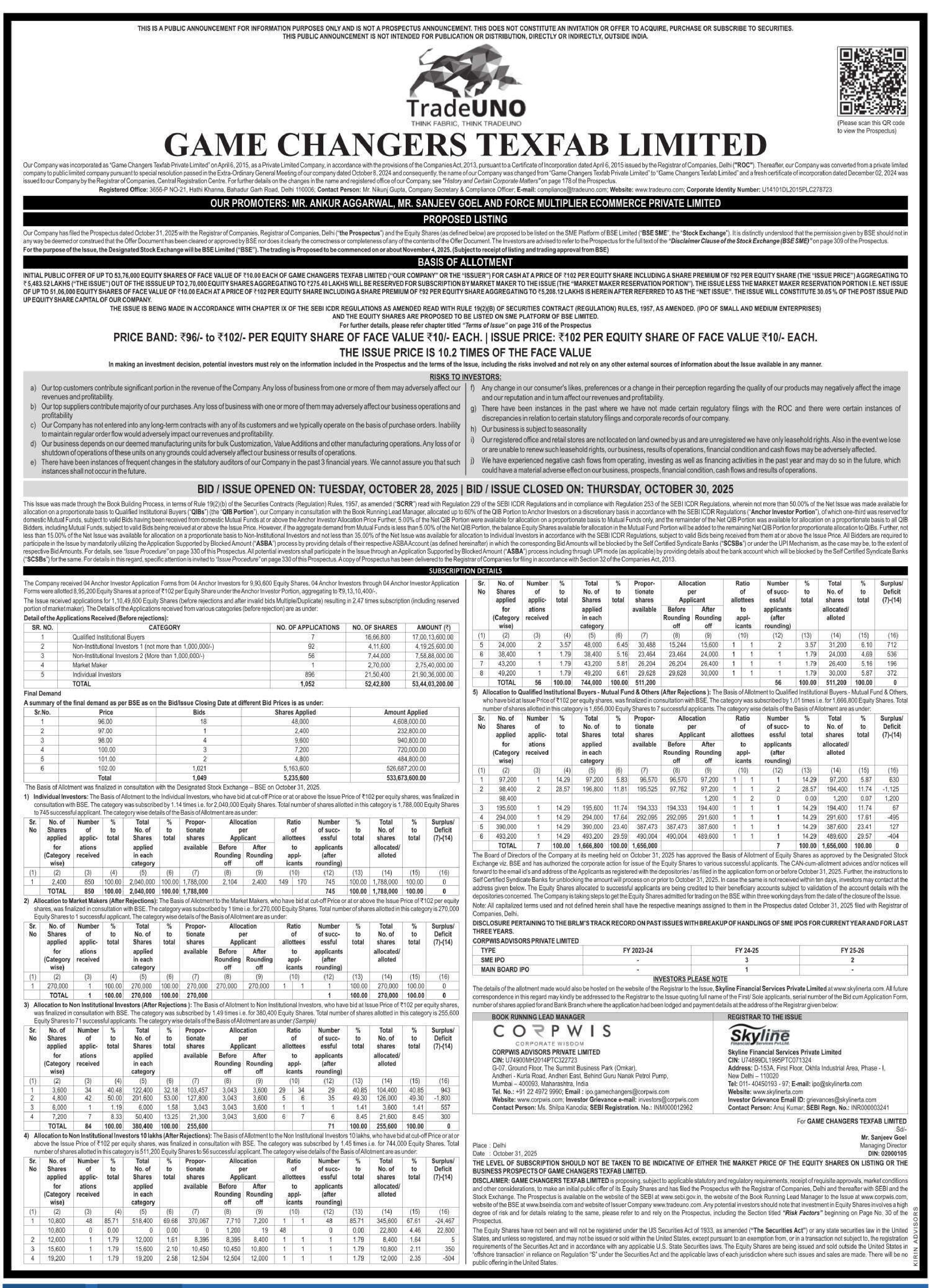 | Game Changers Texfab Limited | 10.58 | 10.00 |