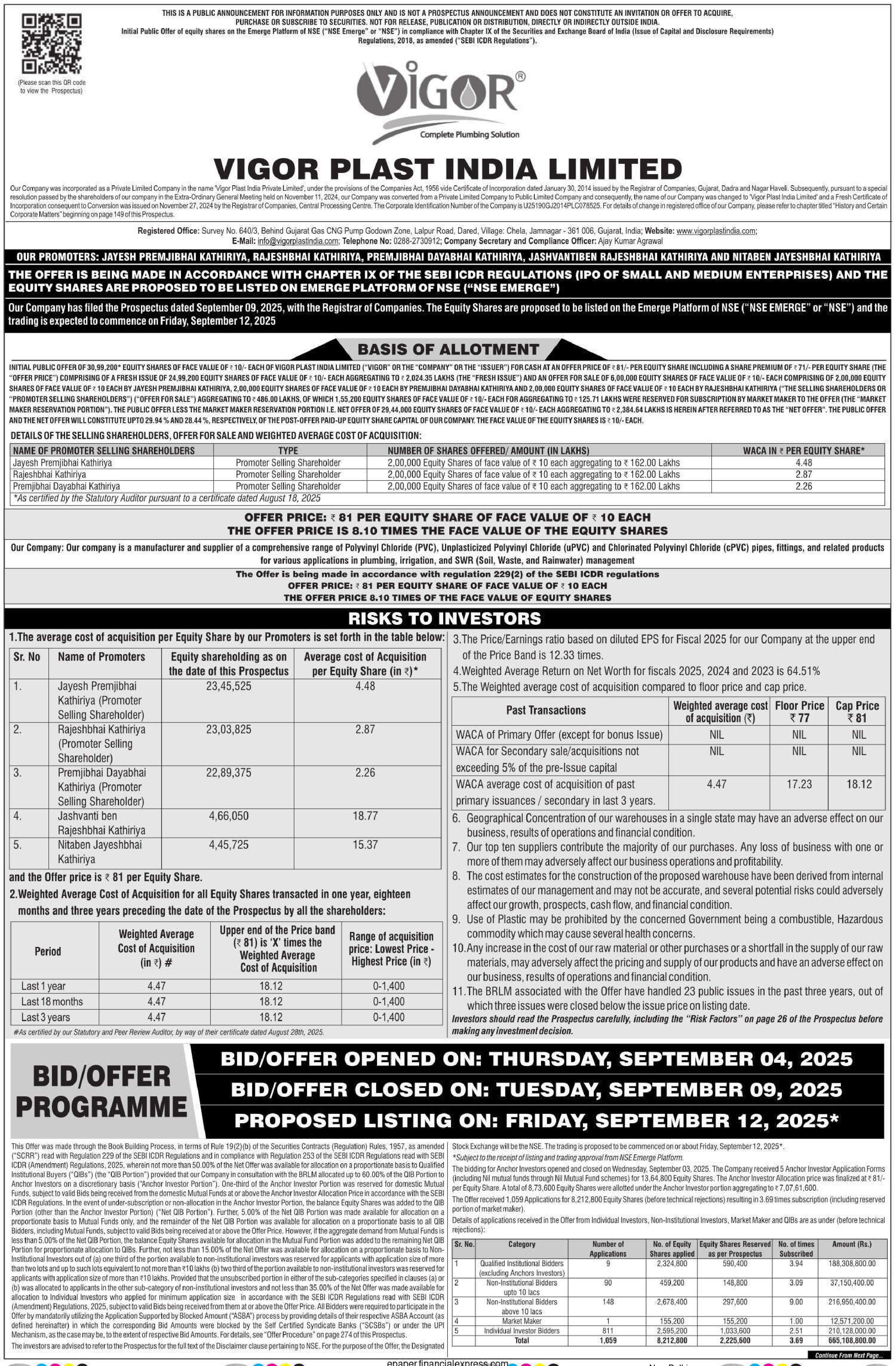 Incorporated in 2012, Vigor Plast India Limited is engaged in the manufacturing and supply of CPVC and UPVC pipes and fittings. The company caters to a wide range of applications across plumbing, sewage, agriculture, and industrial sectors.