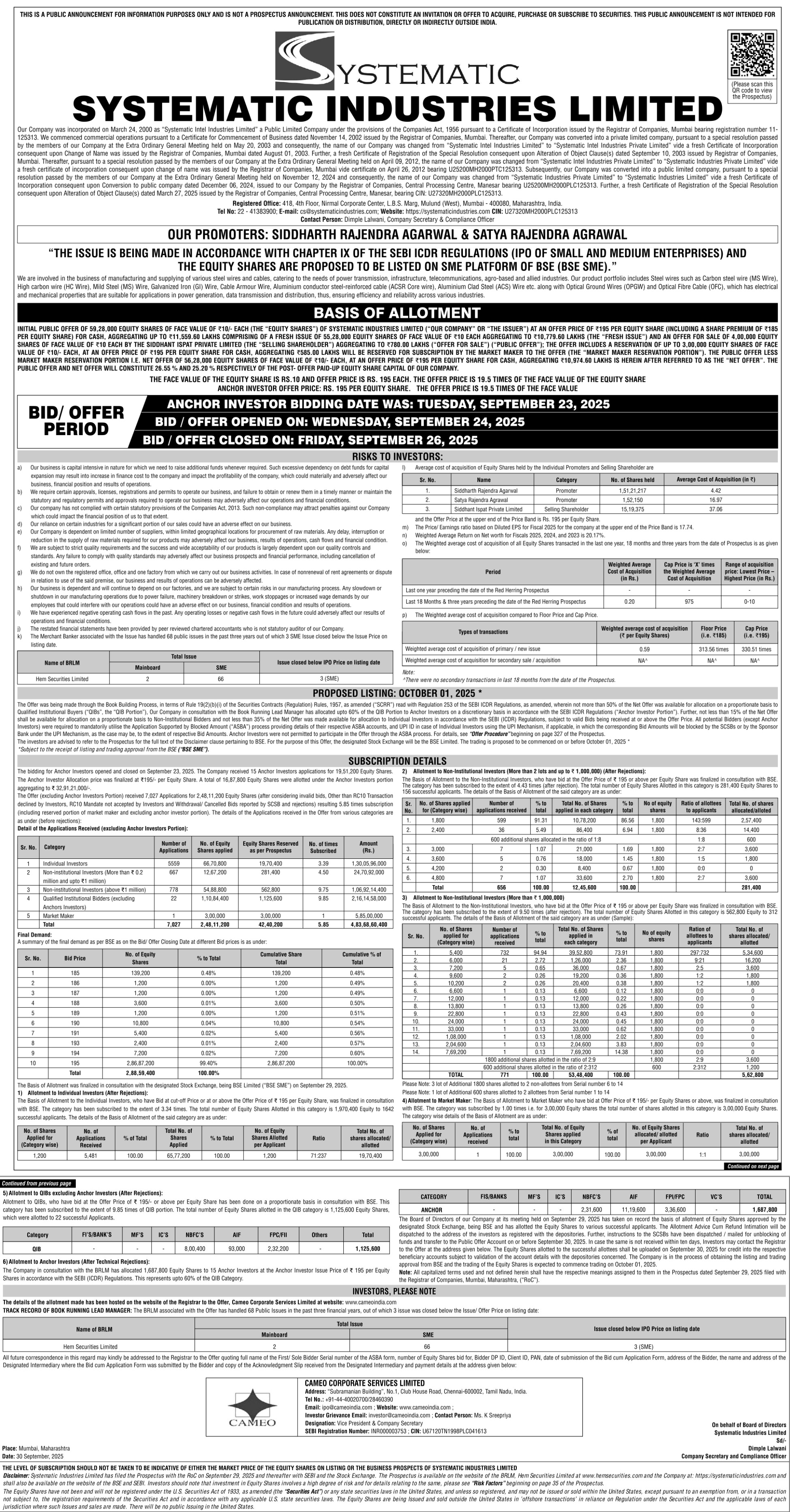 Systematic Industries Listing Price