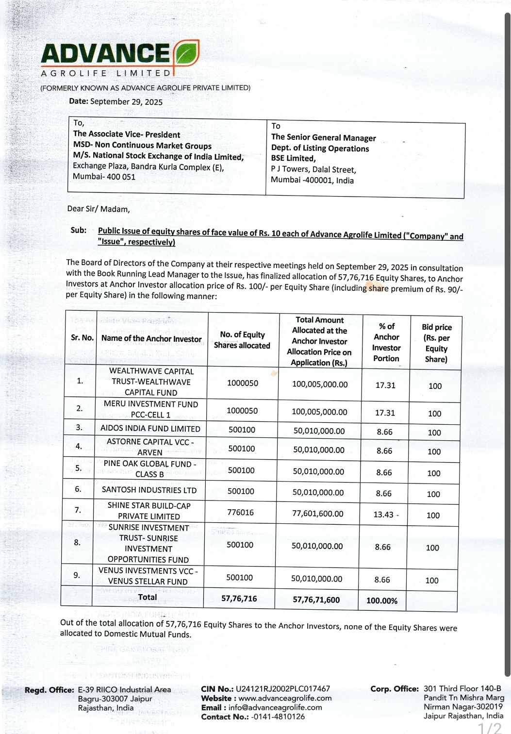 Advance Agrolife Ltd. | 22.42 | 29.11 | 5.7 |